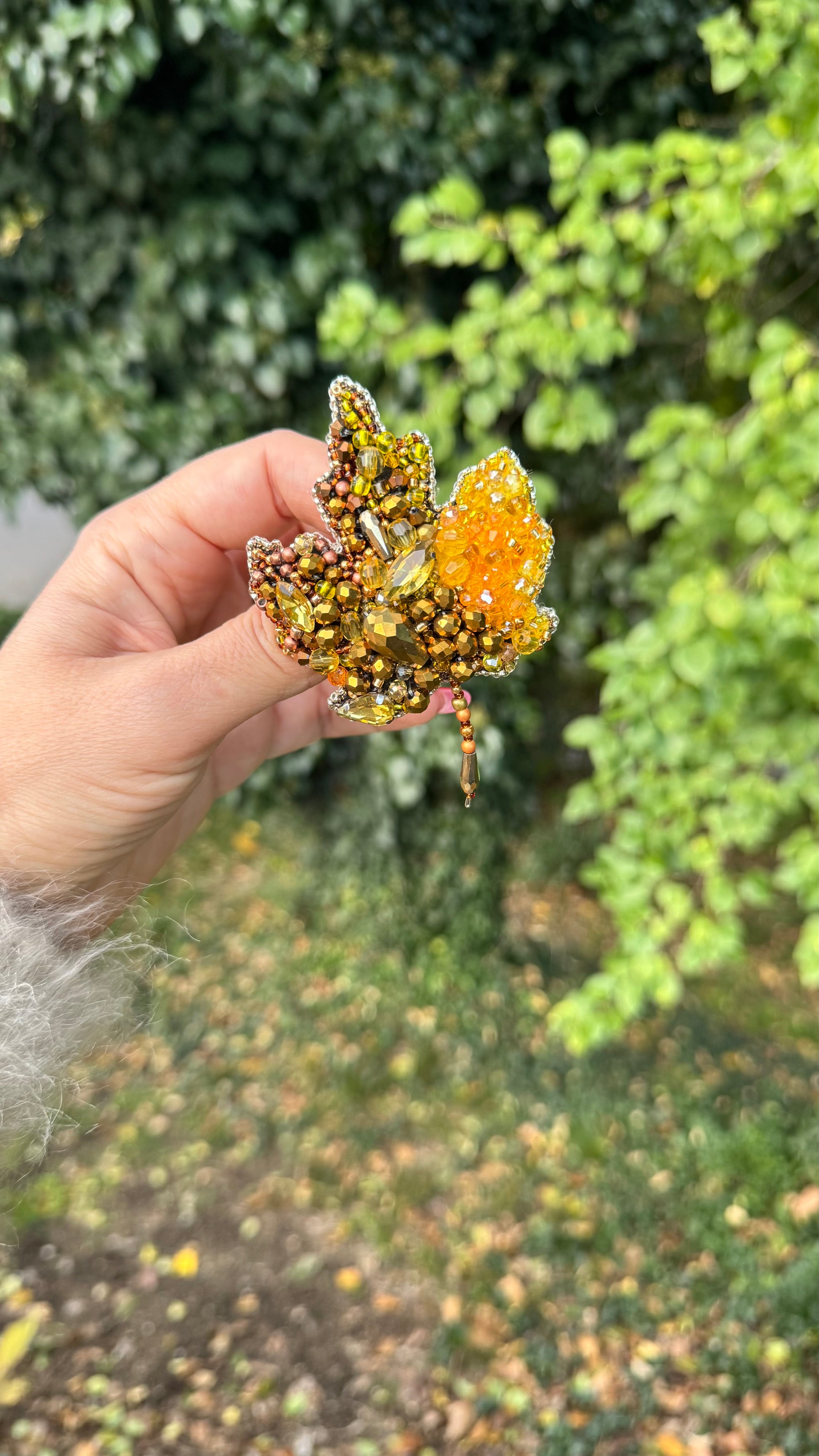 Broșă cusută manual cu mărgele diverse. Se livrează în cutie personalizată OZANA Fine Art. Transportul este inclus în preț cu următoarele mențiuni: coletul va fi trimis prin curier dacă nu exista kilometri suplimentari și prin Poștă Română dacă există kilometri suplimentari. Nu fac excepții.