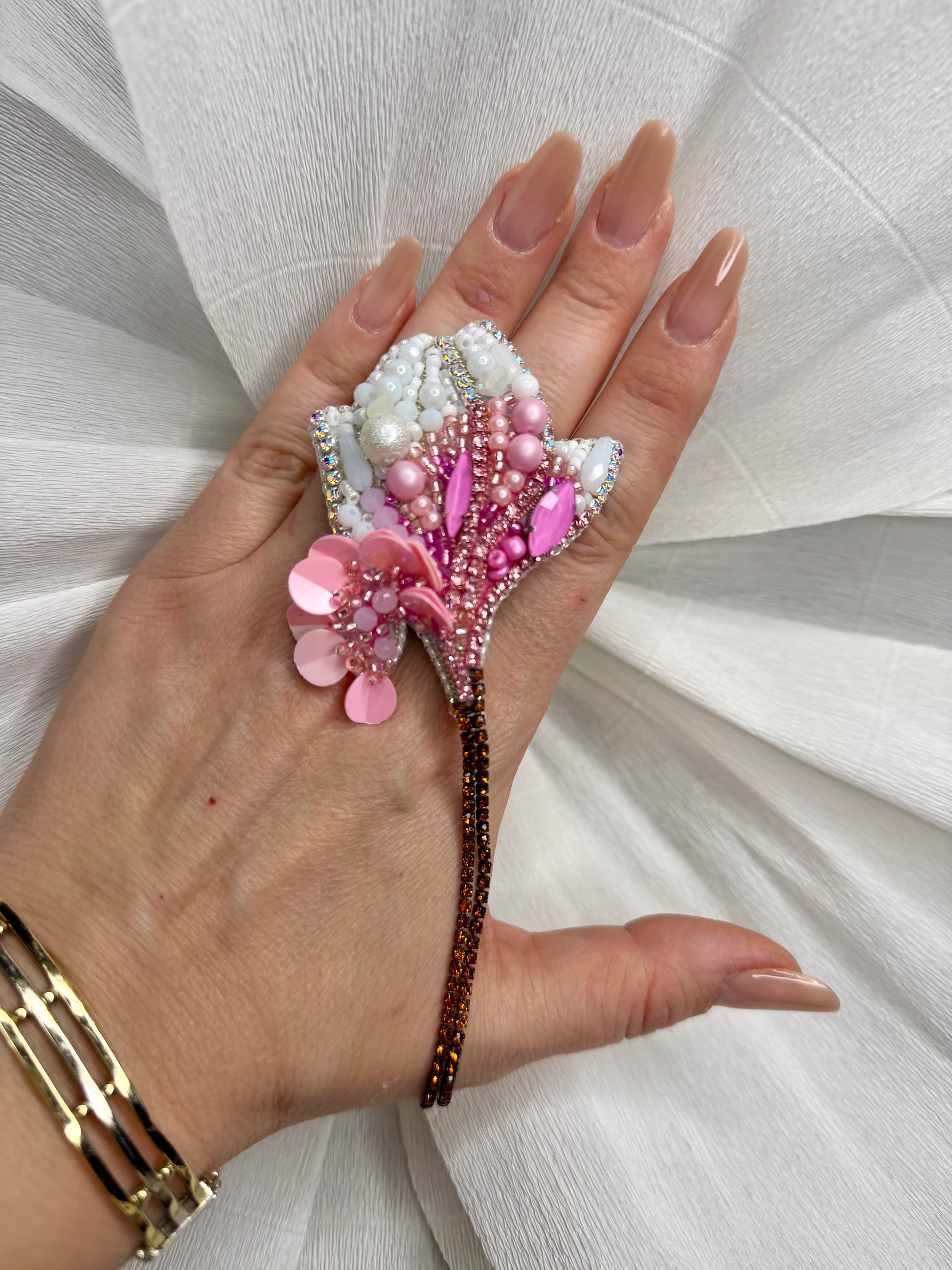 Broșă cusută manual cu mărgele diverse. Se livrează în cutie personalizată OZANA Fine Art. Vine însoțită de fir de mărțișor.
