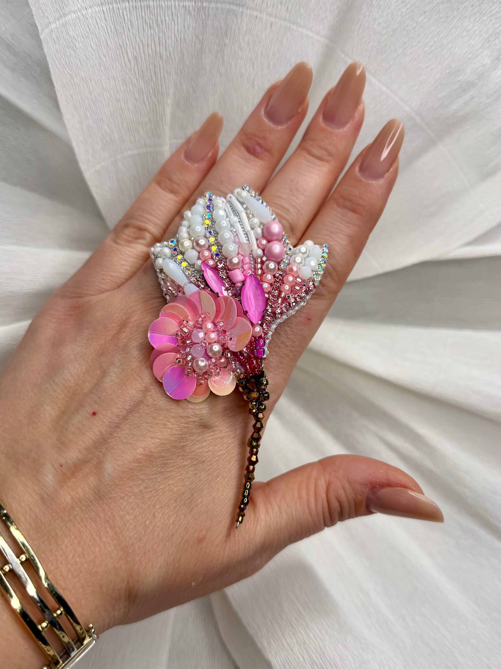 Broșă cusută manual cu mărgele diverse. Se livrează în cutie personalizată OZANA Fine Art. Vine însoțită de fir de mărțișor.